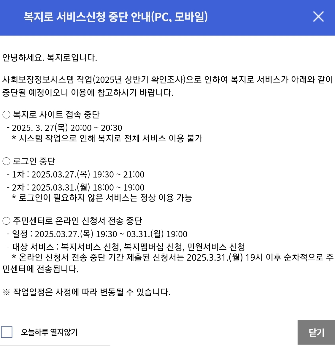 이번 조사에 앞서, 보다 정확한 정보 확인을 위해 사회보장정보시스템 정비 작업이 진행됩니다. 🛠️ 2025년 3월 27일 오후 7시부터 3월 31일 오후 8시까지 시스템 이용이 제한될 수 있어요. 하지만 걱정 마세요! 기초생활 및 한부모 자격 등 수급자 증명서는 '정부24'와 '복지로' 웹사이트, 주민센터 방문을 통해 평소처럼 발급받으실 수 있습니다. 👍